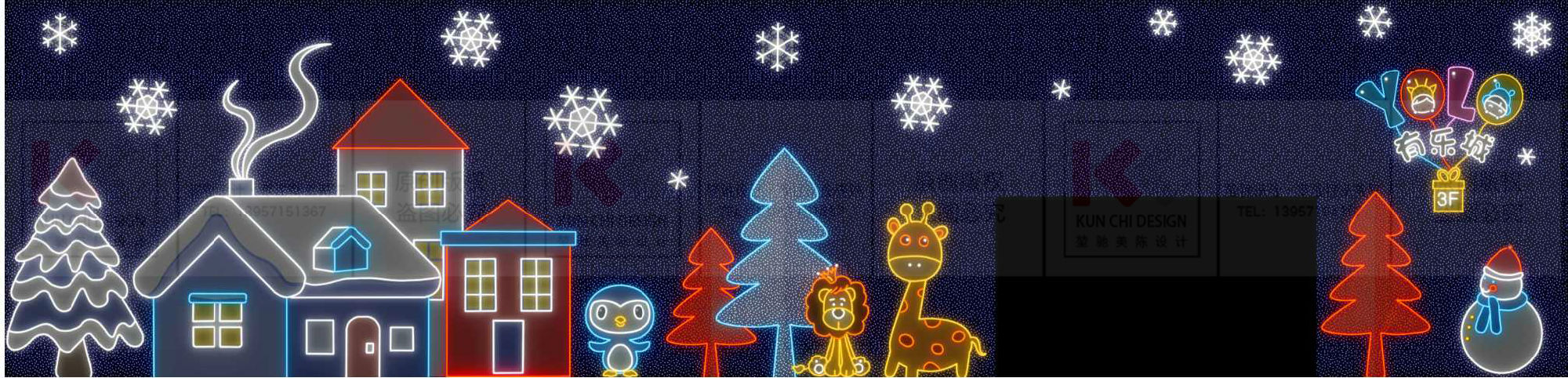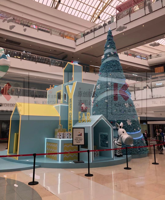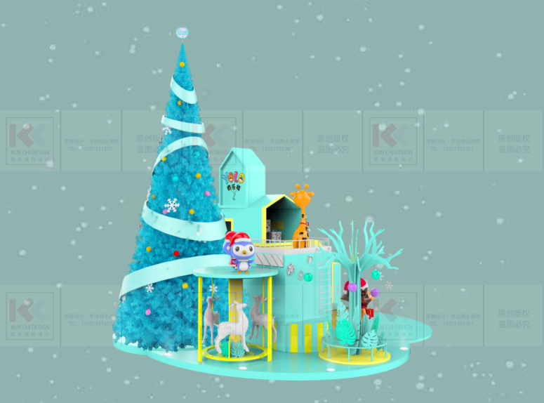 造夢拾光 · 藍至沓來是以圣誕老人的傳統(tǒng)元素為主并結(jié)合北歐童話樹屋對中 庭進行設(shè)計。整體配色偏網(wǎng)紅風(fēng)格,讓潮流和傳統(tǒng)元素進行碰撞,給所有人一個 耳目一新的圣誕購物體驗。整體設(shè)計上結(jié)合了美陳表現(xiàn)方法展現(xiàn)圣誕老人幾個生 活化場景,營造一個溫馨浪漫的氛圍,從而引起顧客對童年幻想的情感共鳴,達 到刺激消費的目的。還可以讓顧客在多維度內(nèi)去感受商場的魅力,從而達到對商 場宣傳效果的傳播,提升顧客的購物體驗和粘性。